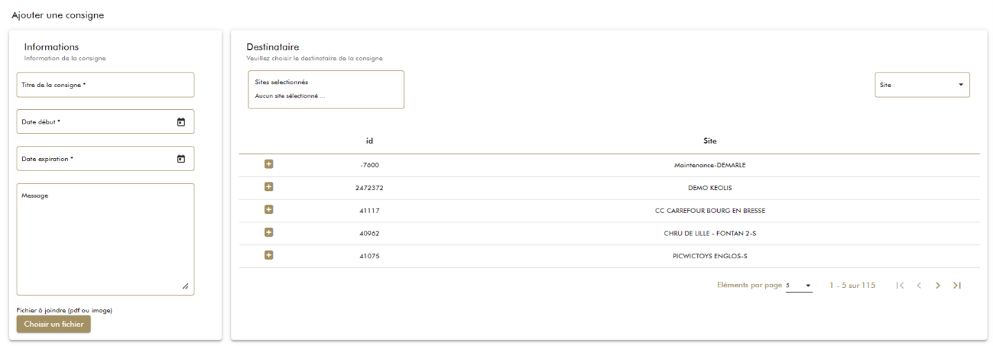 Pour l’ajout d’une consigne destinée aux agents d’un site client, il suffit de cliquer sur le bouton Ajouter une consigne du menu secondaire du Dashboard MCE. Les informations suivantes sont requises pour la validation d’une consigne :