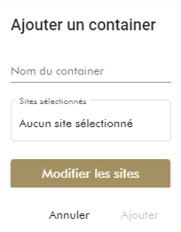 En cliquant sur le bouton STATISTIQUES du Dashboard MCE, l’utilisateur se verra proposer dans un premier temps de créer un container : groupe de graphiques (ex : Container Rondes, PTI, Visites, etc.) via le bouton Ajouter un container. Un nom du container est ainsi demandé, ainsi que le ou les sites concernés. Le container est ainsi créé :