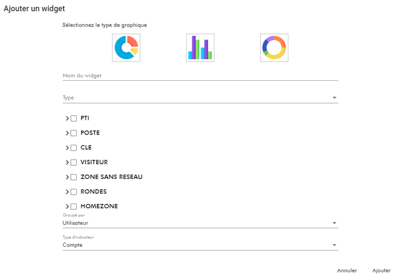 En cliquant sur le bouton + du container, l’utilisateur est invité à ajouter un widget (graphique) à travers la fenêtre suivante :