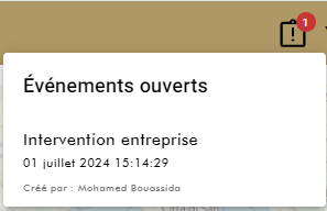 Le nombre d'événements ouverts est indiqué en haut à droite de chaque page. En cliquant sur le bouton correspondant, la liste complète des événements ouverts s'affiche. Il est par la suite possible d'ouvrir un événement afin de le modifier et le sauvegarder, ou alors le clôturer (cf. section suivante).