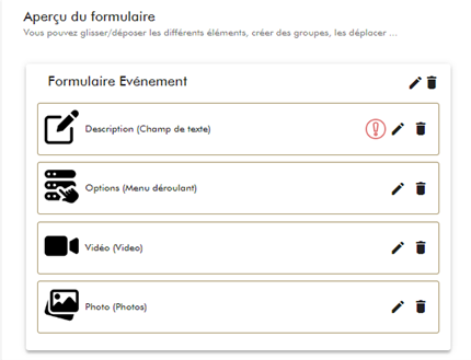 L’Aperçu du formulaire résume tous les éléments qui composent le formulaire, et il reste possible de les modifier, de les supprimer ou de modifier leur ordre d’apparition.