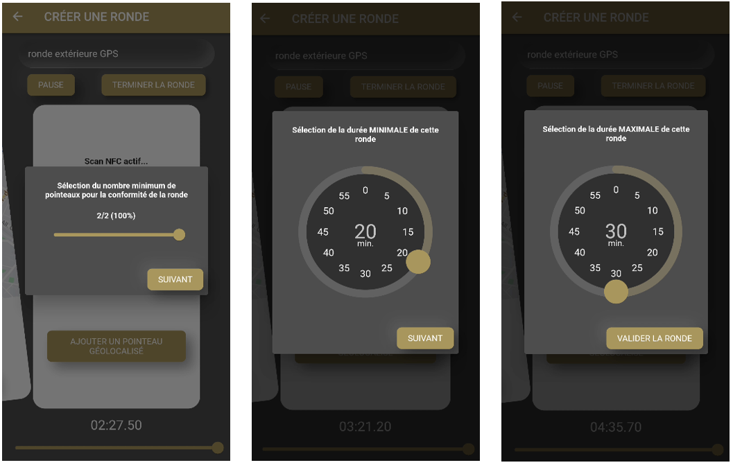 Dès lors que tous les pointeaux de la ronde sont ajoutés, le superviseur devra cliquer sur le bouton TERMINER LA RONDE. Il sera ensuite amené à définir les 3 paramètres suivants :