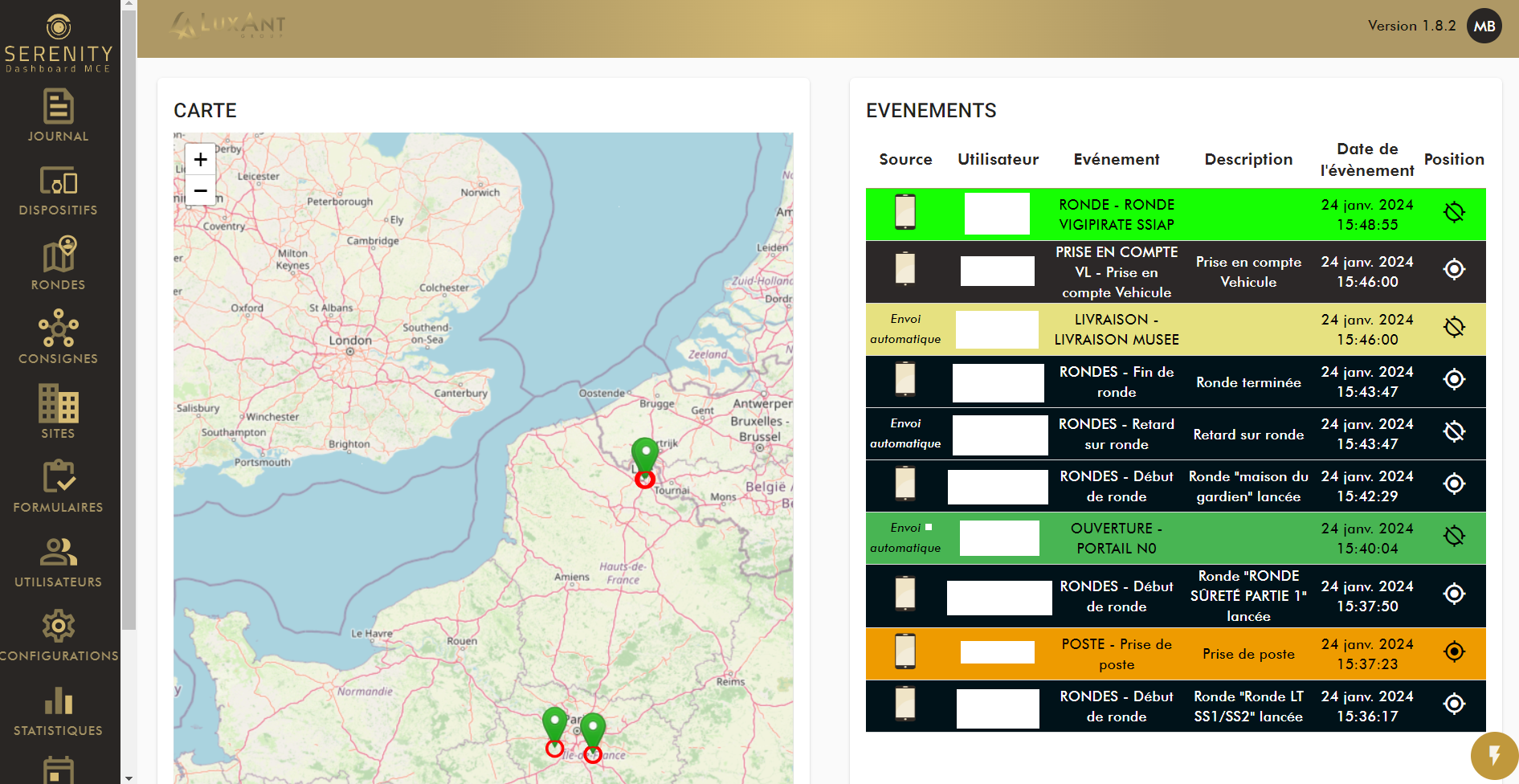 Les utilisateurs de l’application SERENITY MCE (agents de sécurité ou superviseurs) ont la possibilité de visualiser l’ensemble des événements du site dans lequel ils se trouvent, ou de filtrer uniquement sur les événements et alertes qu’ils ont créé eux-mêmes.