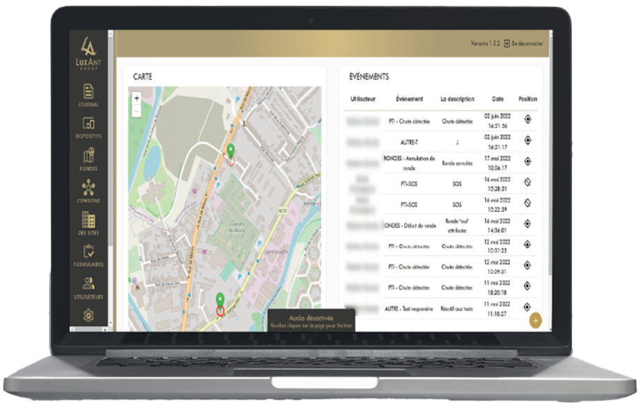 La page d’accueil du Dashboard contient principalement le menu des fonctionnalités (à gauche), la liste des 10 derniers évènements de la main courante, ainsi que leur localisation sur la carte.
