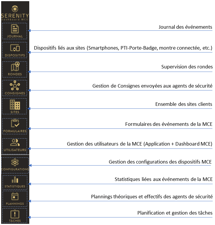 SERENITY MCE est composée de deux applications essentielles : l’application mobile présentée dans la section 2 du présent document, et l’application web – Dashboard, détaillée dans la Section 3.