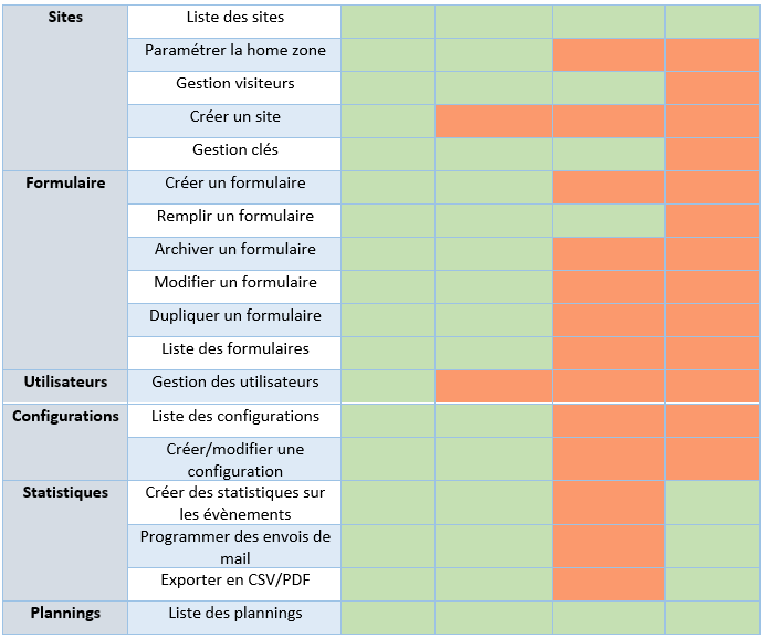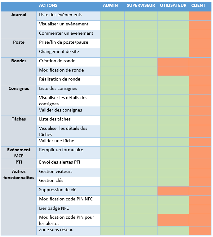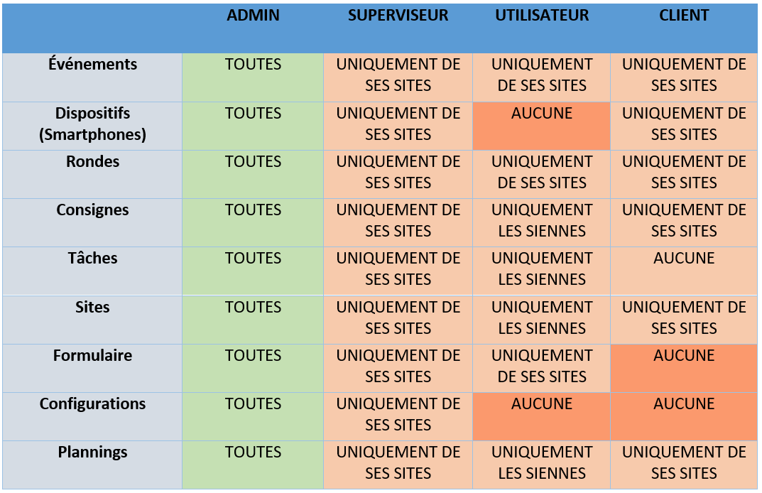 Des droits d’accès aux différentes fonctionnalités de l’application MCE sont accordés en fonction des rôles des utilisateurs : agent de sécurité, superviseur, client ou administrateur. Le tableau suivant présente les politiques principales de droit d’accès de SERENITY MCE :