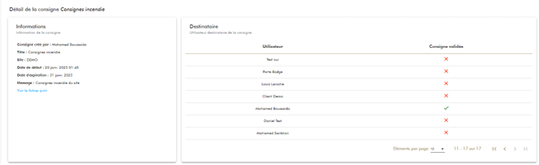 La traçabilité de la validation des consignes par les agents de sécurité est bien entendu assurée via le Dashboard MCE. Ainsi, en consultant la page réservée à une consigne dans le menu principal CONSIGNES, il est très aisé d’identifier les agents n’ayant pas encore validé cette consigne.