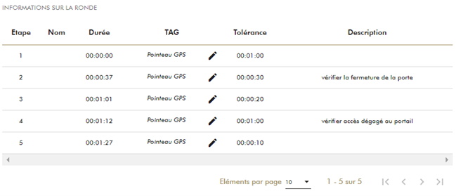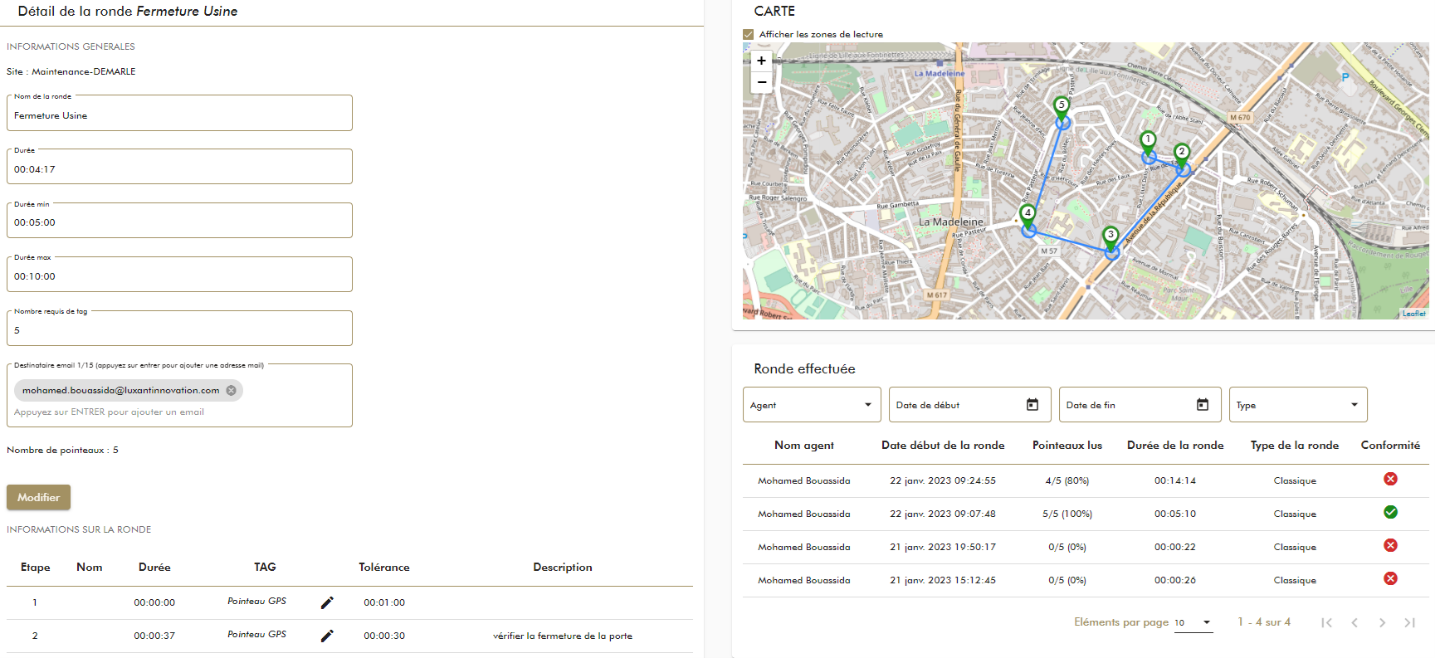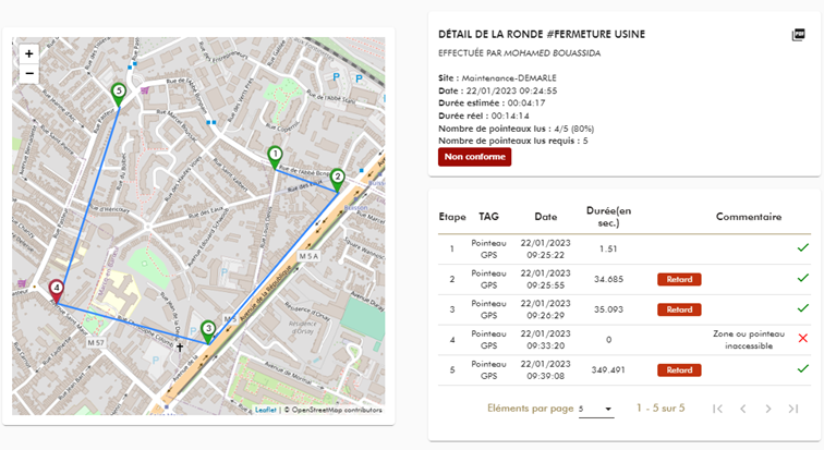 Une page détaillée d’une ronde se présente de la manière suivante (informations générales, détails des pointeaux, positions GPS des pointeaux et traçabilité des rondes effectuées) :