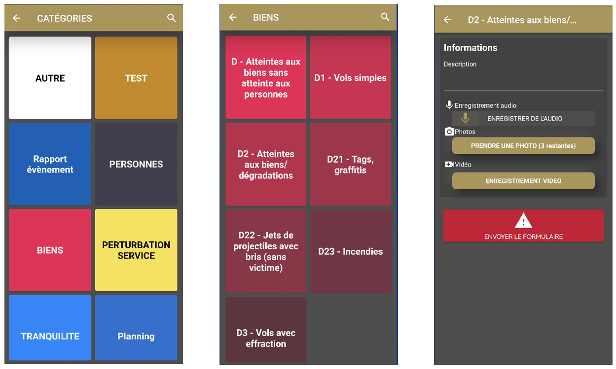 Notre produit SERENITY MCE intègre un système complet de main courante électronique (formulaires customisés en fonction des événements, illustration avec des photos, vidéos, voix, supervision en temps réel, etc.). Les agents de sécurité sur le terrain disposent ainsi d’un ensemble de formulaires prédéfinis (via le Dashboard MCE), correspondant à tous les événements / incidents qu’ils doivent noter dans le journal MCE. Un intérêt particulier a été porté à l’interface de saisie des événements afin qu’elle soit la plus simple, la plus intuitive et la plus rapide possible. De la qualité de saisie des événements dans le journal MCE, dépend la qualité de la prestation des agents de sécurité.