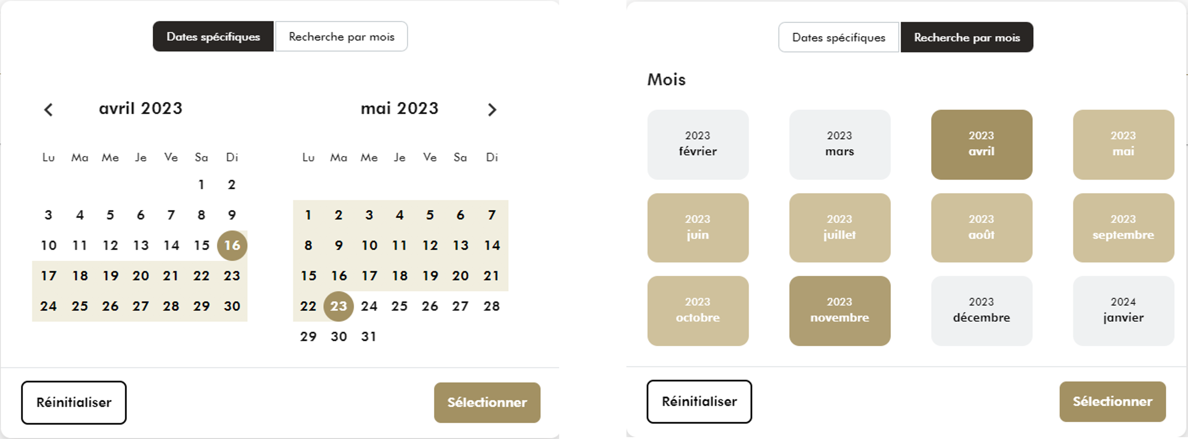 Le filtre date d'événement propose une sélection de dates spécifiques de début et de fin des événements (jour unique ou intervalle de jours), ou bien une recherche par mois (mois unique ou intervalle de plusieurs mois. Le bouton Réinitialiser permet d'annuler le filtre de date d'événement, et le bouton Sélectionner permet de valider le filtre sélectionné.