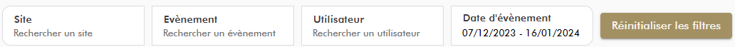 Afin de simplifier la consultation du journal des événements, une barre de recherche est proposée, offrant la possibilité d’appliquer les filtres de recherche suivants :