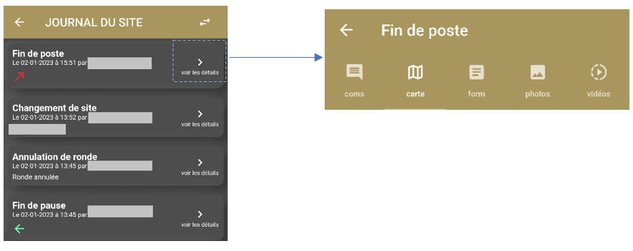 Pour tout événement listé dans le journal, le bouton Voir les détails redirige vers l’ensemble des informations liés à l’événement : date de création, localisation, formulaire associé, photos, vidéos, commentaires …).