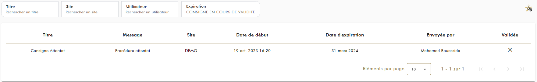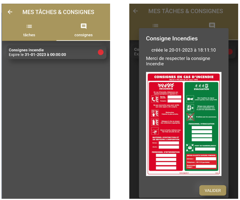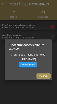 Dans le cas où un fichier est joint à une consigne, les agents de sécurité ne peuvent valider la consigne que si le fichier est consulté (le bouton VALIDER reste inactif jusqu’à la lecture du fichier joint).