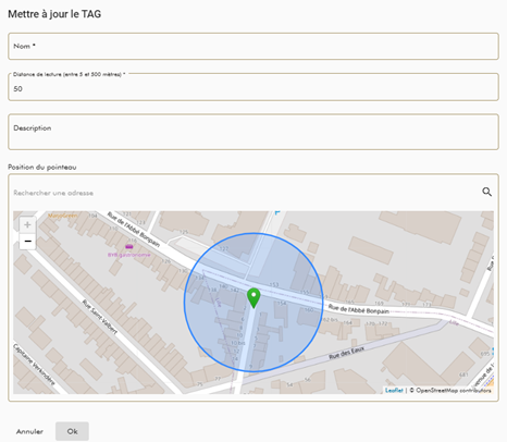 Le superviseur a la possibilité de modifier un pointeau d’une ronde, en cliquant sur le bouton associé au pointeau. Une fenêtre s’ouvre proposant la modification de l’adresse du pointeau, soit en saisissant une adresse, soit en cliquant directement sur la carte. Pour les pointeaux GPS, la distance de lecture est également modifiable à travers cette interface.