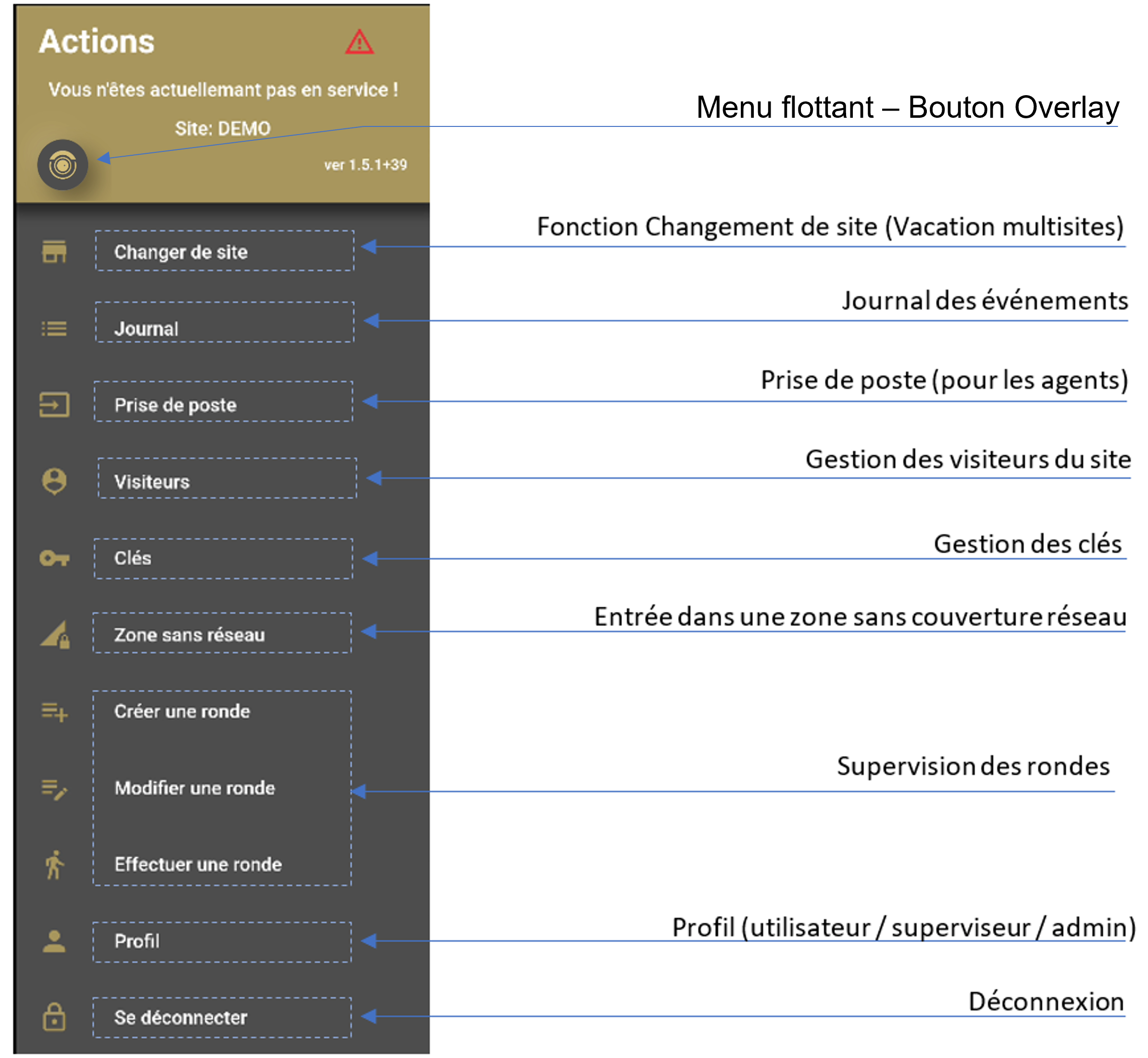 Le menu de l’application MCE est dynamique, il offre ainsi des fonctionnalités en fonction des actions précédentes de l’utilisateur (prise de poste, début de pause, etc.).