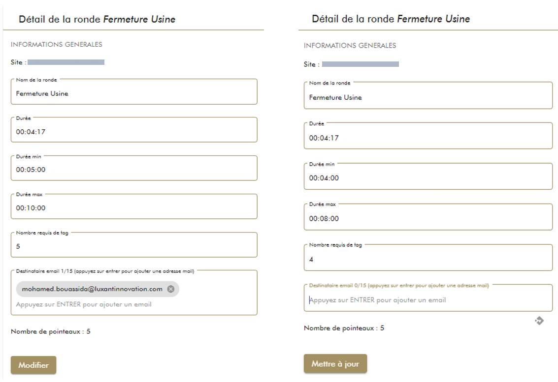 En cliquant sur le bouton Modifier, les champs associés à la ronde deviennent modifiables (nom, durée minimale, durée maximale, seuil de conformité, etc.). Pour valider les modifications souhaitées, il suffit de cliquer sur le bouton Mettre à jour.
