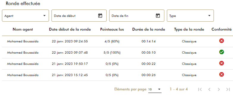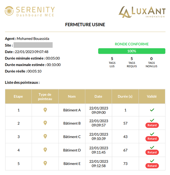 Une ronde dont tous les pointeaux sont lus est automatiquement terminée sans action spécifique de l’agent de sécurité. Un rapport détaillé de la réalisation de la ronde peut être envoyé au superviseur ainsi qu’au client en fonction de ses attentes.
