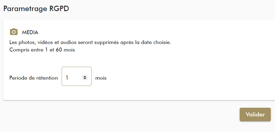 La fonction RGPD permet au superviseur d'un site client de définir la durée maximale de sauvegarde des données média liées au site en question (photos, vidéos, audio).