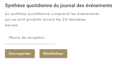 De plus, en cliquant sur le bouton suivant, un envoi automatique par mail de la synthèse quotidienne du journal des événements est proposé. L'utilisateur est ainsi invité à configurer l'heure de réception du mail.