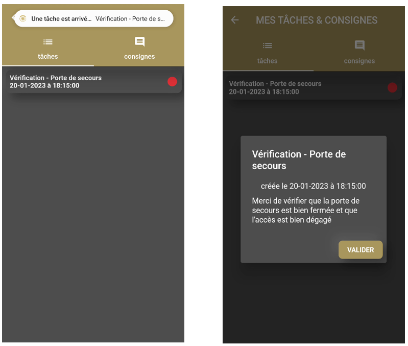Pour une traçabilité optimale et pour répondre au mieux aux besoins des clients, il est important que tous les agents de sécurité valident l’exécution des tâches qu’ils reçoivent sur leur dispositif MCE. Les agents de sécurité doivent également valider la lecture des consignes qui leur sont adressées.