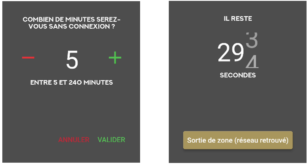 Un agent de sécurité effectuant sa ronde ou réalisant des tâches dans des zones sans couverture réseau (sous-sols, parkings souterrains …) devra notifier sur son application MCE la durée maximale (en minutes) durant laquelle il restera sans couverture réseau (non connecté). Un timer correspondant à cette durée est ainsi enclenché.